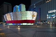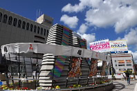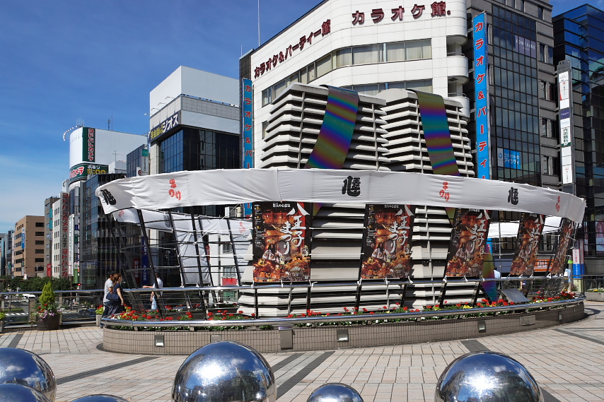 夏、八王子祭の幕とポスターで飾られたマルベリーブリッジのモニュメント「絹の舞」です (2012年8月)。 |