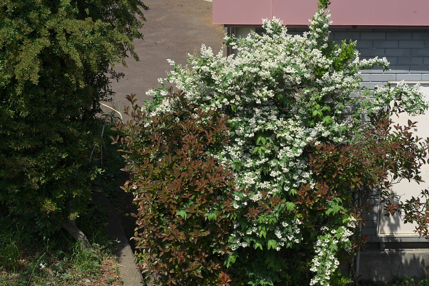 元横山公園のウツギ(空木)を淺川堤防の坂のから園内方向に見下ろしたところです。 左端にピラカンサが見えています。ピラカンサは少し前に花が終わっています。 |