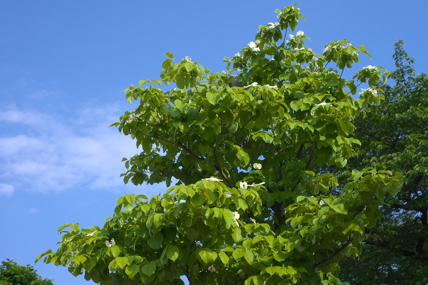 ハナミズキ(花水木)にはやや遅く葉が沢山になってきたころですが、 小門公園のハナミズキはこの年、あまり花を咲かせなかったので新緑と併せて撮ってみました。 よくわからないのですが、南大通りやR16、片倉などの街路樹、他の公園でもハナミズキの花は バラツキが多く、ほとんど花をつけていない木が目立つ年のように思えます (沢山花を咲かせているものもあれば少ない木もや花がほとんど無い木が並木で並んでいたりします)。 花は少ないものの葉の様子からは元気そうで、桜と併せて新緑の緑が鮮やかです。 |