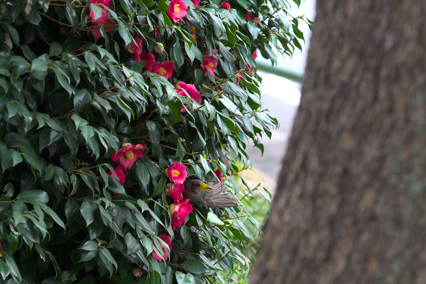 子安公園のヤブツバキ(藪椿)にヒヨドリが来て嘴の周りを花粉だらけにしながら椿の花をついばんでいました。 子安公園の椿の木はやや小さめにまとまったサイズに剪定されてた木が多いですが、 このヤブツバキはやや大きめになっています。 |