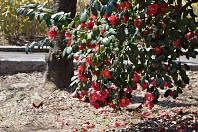 富士森公園には、東口、公園通り、駐車場、慰霊塔、体育館の北側、体育館駐車場他、 園内各区画に色々な場所にツバキ(椿)が植えられています。