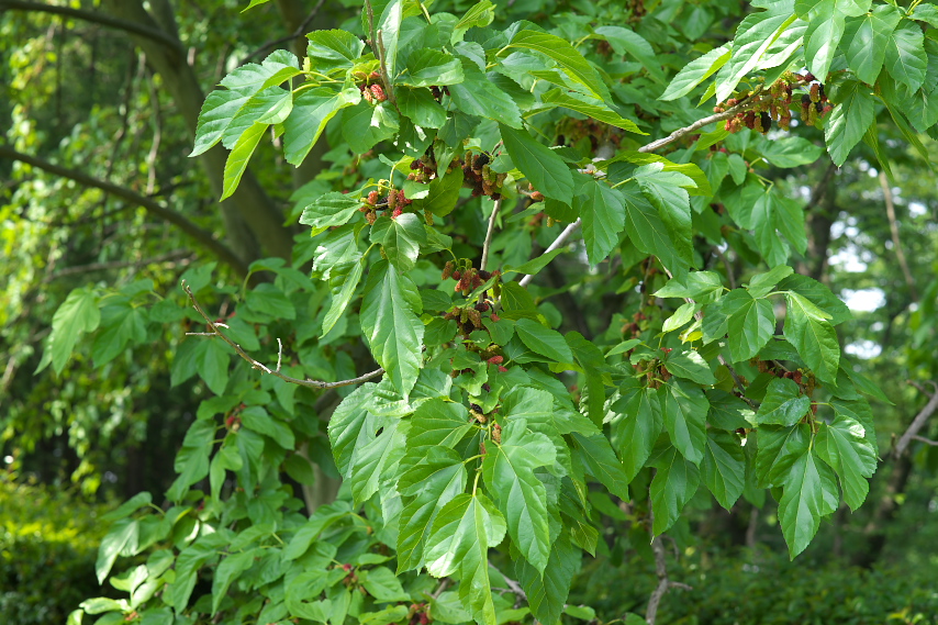 これも同じ片倉城跡公園の二の丸広場の桑の木の低い位置の枝です。 前の写真は上の方の枝ですが、低位置の枝にも沢山の実をつけています。 写真の奥は空掘り、上色に見えているは新緑の桜の木です。 |