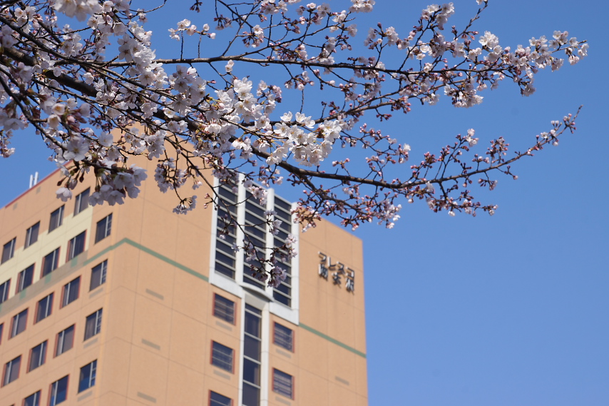 春、南大沢中郷公園のサクラ(桜)が開花した時、花が咲く枝をフレスコ南大沢の方向に見上げたところです。 |