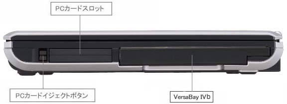 VersaPro / VersaPro J 左側面![]() 左側面には、ワイヤレススイッチ/ワイヤレスランプ(ワイヤレスLAN機能を搭載したときのみ)、IEEE1394(4ピン)、マイク入力、ヘッドフォン/オーディオ/光デジタルオーディオ(S/PDIF)出力が並んでいます。 VersaPro / VersaPro J 右側面![]() 右側面には、PCカードスロット(TYPEI/U×2スロットまたはTYPEV×1スロット、カードバス対応)、拡張ベイVersaBay IVbがあります。拡張ベイにはCD/DVDドライブやセカンドバッテリや増設HDDが搭載できます。 VersaPro / VersaPro J 背面![]() 背面部には、USB2.0×3、FAX/モデム(56kbps V.90対応)、LAN(1000BASE-T/100Base-TX/10Base-T)、Sビデオ出力、VGA出力、DCコネクタ、盗難防止ロックがあります。